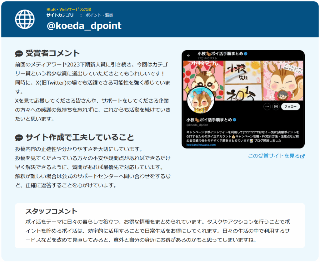 バリューコマース メディアアワード2023下期 新人賞受賞